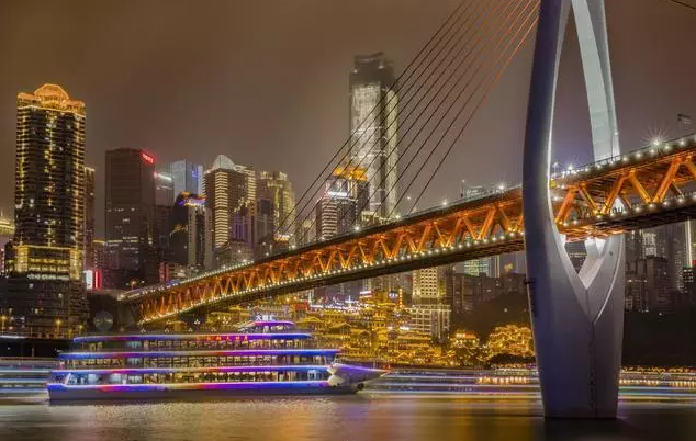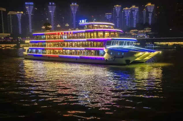 长江大桥、朝天门大桥、朝天门广场、渝中半岛、两江汇流;朝天扬帆大型音乐灯光表演;解放碑中央商务区;江北嘴重庆歌剧院、科技馆;以及最具巴渝传统建筑特色“吊角楼”为主体的洪崖洞民俗风貌区,环绕渝中半岛70分钟至90分钟游览美丽山城夜景。游览完行程后就在朝天门码头下船,结束愉快的旅程。